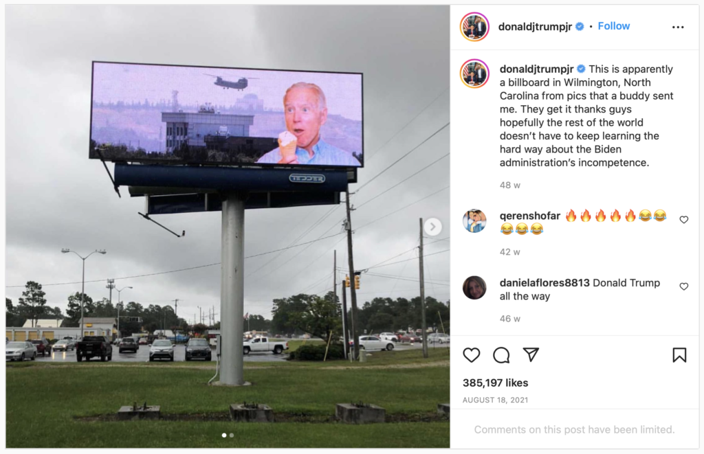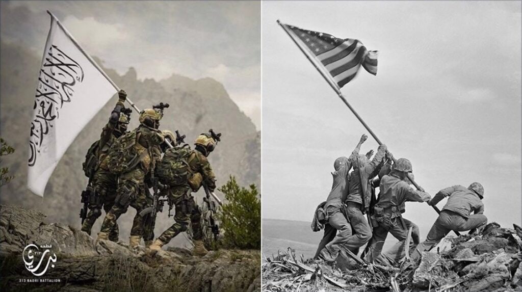 This is the stuff that memes are made of. If the Taliban wanted to lord their effortless entry into Kabul over the outgoing peacekeepers, they did so with the complicit aid of the very targets of their trolling. Ice-cream images quickly began circulating whether they had anything to do with 2021 or not.[7]Dilip Kumar Sripada, ‘Old Photo of an Afghan Citizen Falsely Shared as Recent Visuals of a Taliban Fighter Enjoying Ice Cream’, Factly, 26 August 2021, … see more The Joe Biden ice-cream meme which shows the President licking gelato against a backdrop of the Kabul evacuation took flight not in Kandahar, but in North Carolina.[8]Donald Trump Jr, ‘This Is Apparently a Billboard in Wilmington, North Carolina’, photo, Instagram, 18 August 2021, https://www.instagram.com/p/CSsufeWjSRP/ Even the restaging of the 1945 Iwo Jima flag photograph with Taliban colors, supposedly produced to strike at the heart of American pride, appears not to have been deliberate.[9]Dan Evon, ‘Did Taliban Recreate Iwo Jima Photo?’, Snopes.com, 23 August 2021, https://www.snopes.com/fact-check/taliban-iwo-jima/ For each of these images and their endless clones, it was the American and Western audiences that made it possible for the memes to gain any currency at all—on 4chan, Twitter, and the news. Compare the success of these aesthetic outputs with the Taliban’s more ‘traditional’ efforts to mock the US with Pepe and Wojak memes,[10]OpIndia staff, ‘Taliban Accounts Mock USA with Pepe the Frog and Other “edgy” Memes’, OpIndia (blog), 31 August 2021, https://www.opindia.com/2021/09/taliban-leader-accounts-mocks-usa-with-pepe-the-frog-and-other-edgy-4chan-memes/ and it becomes clear that the bumper cars and ice-cream images are in a league of their own.