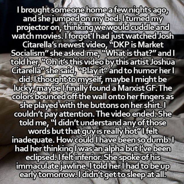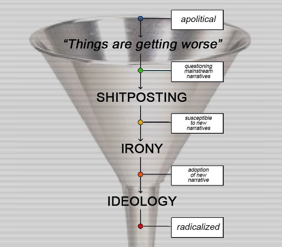 Here, Citarella proposes, is the left artist’s opportunity to make their mark: rather than watch the depressed, lonely, incel-in-the-making teen slide down the radicalization funnel towards the alt-right, why not lead them from the nihilistic void to early Nick Land[54] Land holds a peculiar status in communities like Citarella’s: he is known for being a heavy influence on the neoreactinary movement, but his early alignment with the left means that references to him can be ambiguous. and Gilles Deleuze, and eventually Mark Fisher? To do this, the artist must adopt the ever-changing language of the shitposter and go hard on irony. There’s no telling if what Citarella is suggesting is a LARP and whether he is prepared to take the responsibility for his audience’s ability to evaluate aesthetic clues that may stand in for socialism or fascism with equal credibility. But does any artist, ever?
