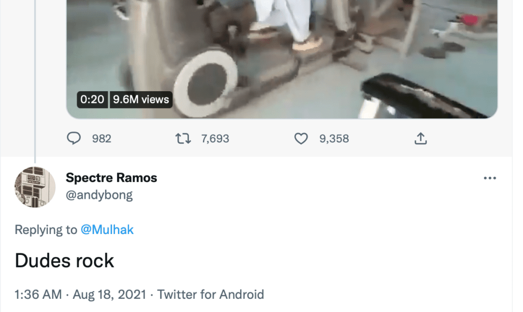 Perhaps all of this—the war, its end, the coup—has been an all-absorbing LARP that got out of hand. The way out of the Baudrillardian dead-end is to abolish the meme as a category that is synonymous with predetermined political outcomes and to consider its aesthetics as separate from ideology. Perhaps the Taliban were just eating ice-cream and playing games and we simply got duped. Perhaps, in Afghanistan, war is a form of theater we didn’t notice was scripted.[12]The journalist Sarah Chayes suggest that theater is a significant part of Afghan war culture. ‘Afghanistan’, Thinking Allowed (BBC Radio 4, 11 October 2011), https://www.bbc.co.uk/programmes/m00108bj Perhaps going to the gym is what 20-something males do between popping slot machines at the arcade. Is it any wonder that the first tweeted reply to the video of the Taliban at the presidential palace gym was the pitch-perfect ‘dudes rock’?[13]Andre Ramos, ‘@Mulhak Dudes Rock’, Tweet, Twitter, 18 August 2021, https://twitter.com/andybong/status/1427791427942092805