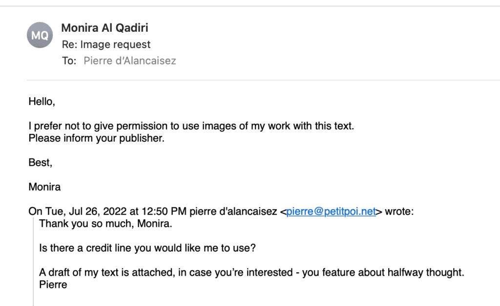 The strength of Behind the Sun is precisely its ability to evade the Canadian exhibition’s shoehorning of ‘Indigenous Peoples’ land rights’[42]‘Monira Al Qadiri at DARC’ into the interpretative apparatus, and to retain the slippery relationship between aesthetic markers and political alignment. The video is a powerful anti-war hymn, made even more potent by the possibility that it could just as easily be a battle cry. However, one would search in vain for an acknowledgement of this ambiguity in accounts of Al Qadiri’s work because acceptance within the art world comes at the cost of swearing allegiance to Benjamin’s dictate. In return, the museum renders the artefact inaccessible to anyone who hasn’t already subscribed to the liberal ideologies of the institution. As if to prove this point, Al Qadiri withdrew her permission to reproduce a still from her video on being presented with a draft of this text.