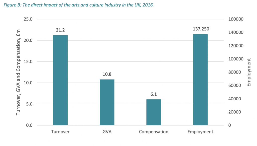 Looking at data from Arts Council England,[6]Cebr, Contribution of the Arts and Culture Industry to the UK Economy: Report for Arts Council England (London, April 2019). we see the source of such exaggerations. A 2019 report that valued the arts GVA at just above £10bn admitted to counting the value of culture in some bizarre ways. For example, the headline total number used was about £22 billion and was arrived at by counting not only the value of the industry, the value of its supply chain, but also the induced value. That total value includes, for example, the rent and grocery bills paid by artists, which renders such an estimate completely meaningless. So no, the arts were not worth £116bn, not £22bn, but about £10.6bn in GVA before the pandemic.