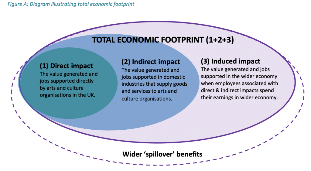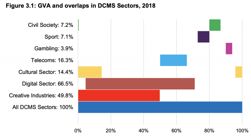 But it’s not only the industry’s spokespeople that play loose with numbers. The Department for Digital, Culture, Media & Sport is aware of this trick and is somewhat complicit in reproducing fuzzy definitions and triple-counting. The official statistics the department produces contains many overlaps so that in the end, it’s difficult to know whether the analysis confuses the value of the visual arts with, for example, the value of digital services.[7]‘DCMS Sectors Economic Estimates 2018: GVA’ (Department for Digital, Culture, Media & Sport, 2020) [accessed 1 June 2020].