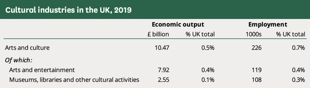 Of course, the livelihoods of the two million were in peril and that is not trivial, but there’s a red flag in this message. What is meant by the ‘creative industries’ includes many industries that are not the arts. Most of the employment for which the campaign tried to take credit come from the film, digital, and games industries. Are those the arts? Data from the House of Commons, by contrast, do not entertain such ambiguity and point to a very different number.[4]John Woodhouse and Georgina Hutton, Covid-19 and the Arts and Culture Sectors, Briefing Paper (House of Commons Library, 25 February 2021) Can we defend the value of the visual arts by claiming credit for the employment of software programmers?